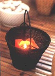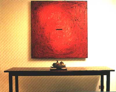 The Johnsons' small sala is a rustic black-and-white suite dressed in French doors, abaca woven curtains, and Yola's creative touch with textures and textiles. A wide collection of "primitive" ebony-black furniture from the Philippine Cordillera is fitted in white ramie upholstery and ivory silken throw pillows All around are baskets from the Cordillera or ceramic bowls of interesting seeds or pods; design magazines; and abstract modern artworks by Roberto Chabet. The dining room comprises a modern-minimalist two-piece table made old dark and rare supa wood; crowned by a fantasy candelabra that is lit by tea lights. A vibrant red abstract (above) by Roberto Chabet hangs over a dark table made of rare supa wood.