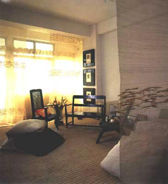 Popi Laudico's new flat is fashioned with the same attention to detail as her mother's. Gauzy abaca weave curtains drape the east-facing windows, and also act as "walls" that delineate the spaces within. The "living room" is a wide expanse of thick woven abaca carpet defined by the drapes and veils of abaca separating it from the "dining area." The furniture is ethnic, minimal and modern-three soot-black chairs from the Cordillera. Says Popi of her artistic abaca atelier: "The translucent layers delineate the space, without compartmentalizing it. And they let me feel secure -like being under a kulambo (mosquito net)."