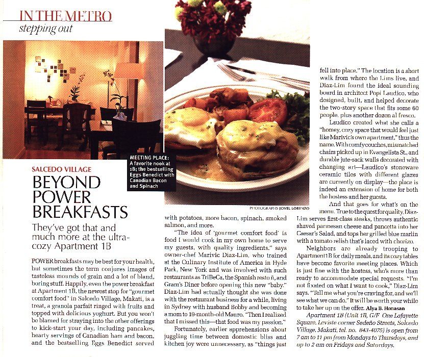 Neighbors are already trooping to Apartment 1B for daily meals, and its cozy tables have become favorite meeting places. Which is just fine with the hostess, who’s more than ready to accommodate special requests. “I’m not fixated on what I want to cook,” Diaz-Lim says. “Tell me what you’re craving for, and we’ll see what we can do.” It will be worth your while to take her up on the offer."