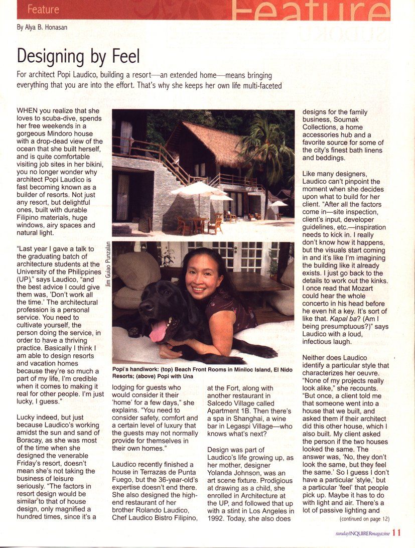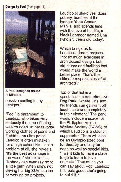 WHEN you realize that she loves to scuba-dive, spends her free weekends in a gorgeous Mindoro house with a drop-dead view of the ocean that she built herself, and is quite comfortable visiting job sites in her bikini, you no longer wonder why architect Popi Laudico is fast becoming known as a builder of resorts. Not just any resort, but delightful ones, built with durable Filipino materials, huge windows, airy spaces and natural light.