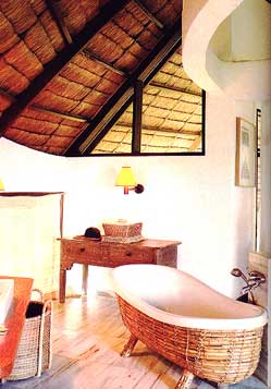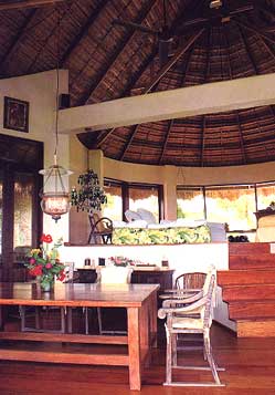 The floors of the main house are built with a deep mahogany-colored wood, while the walls done in a lime finish provide a clean bright surface. All the furnishings in the living room are by interior decorator Yola Johnson. Known for using native materials in her furniture, Johnson incorporates them into modern shapes and when one sits in a chair that she designed, one does not get up. This is the entire feel of the whole living area where comfortable couches and large pillows are strewn across the room.