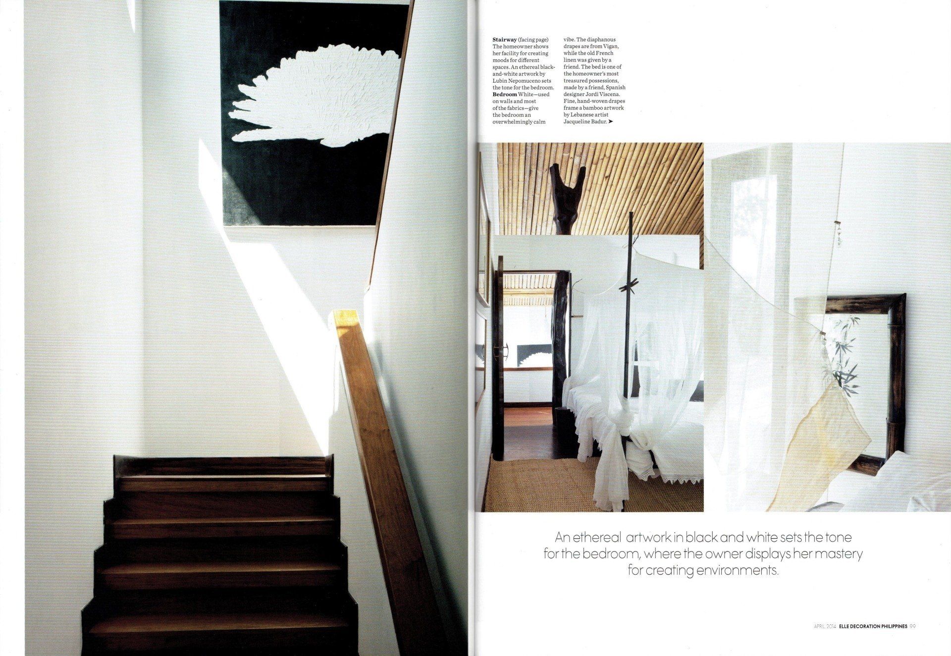 With this inner chambers cleansed and cleared, the townhouse was ready to receive the decorative and functional elements meticulously chosen by its mistress. Bamboo – a riveting presence in the adobe – takes over the ceiling and practically envelops an entire room. Furnishings and accents crafted by skilled artisans give the space an organic vibe, while art – mostly gifts from friends and relatives – would find their own permanent place, settling on blank walls and ledges and vacant spots waiting to be claimed. Going up a short flight of stairs, an ethereal artwork in black and white sets the tone for the bedroom, where the client displays her mastery for creating environments. One is overcome with calmness at the sight of diaphanous fabrics draped from ceiling and over the bed set against a vista of the greens and mountains.