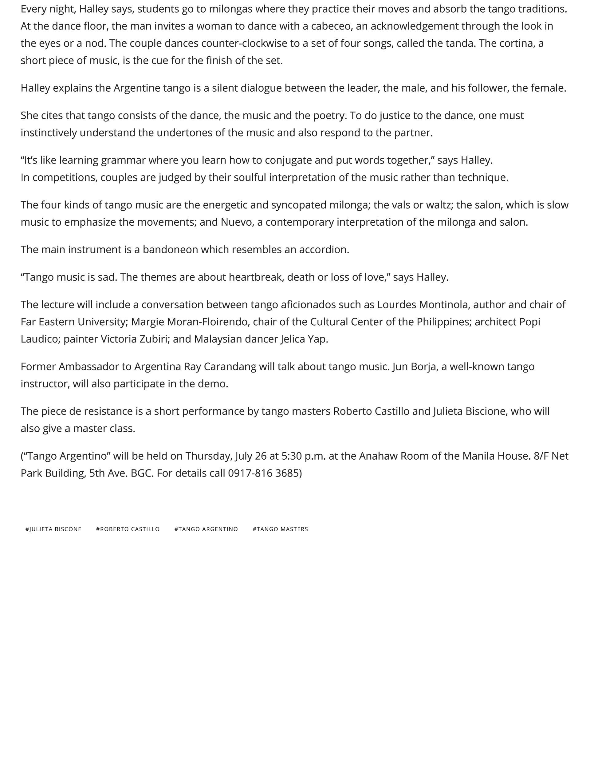 Laudico discovered Argentine Tango in 2013 while on vacation in Buenos Aires, when she walked into a milonga in the middle of the night. She has not stopped dancing since. Today she organizes group classes and Practica sessions in Bonifacio Global City (BGC), Metro Manila, Philippines.