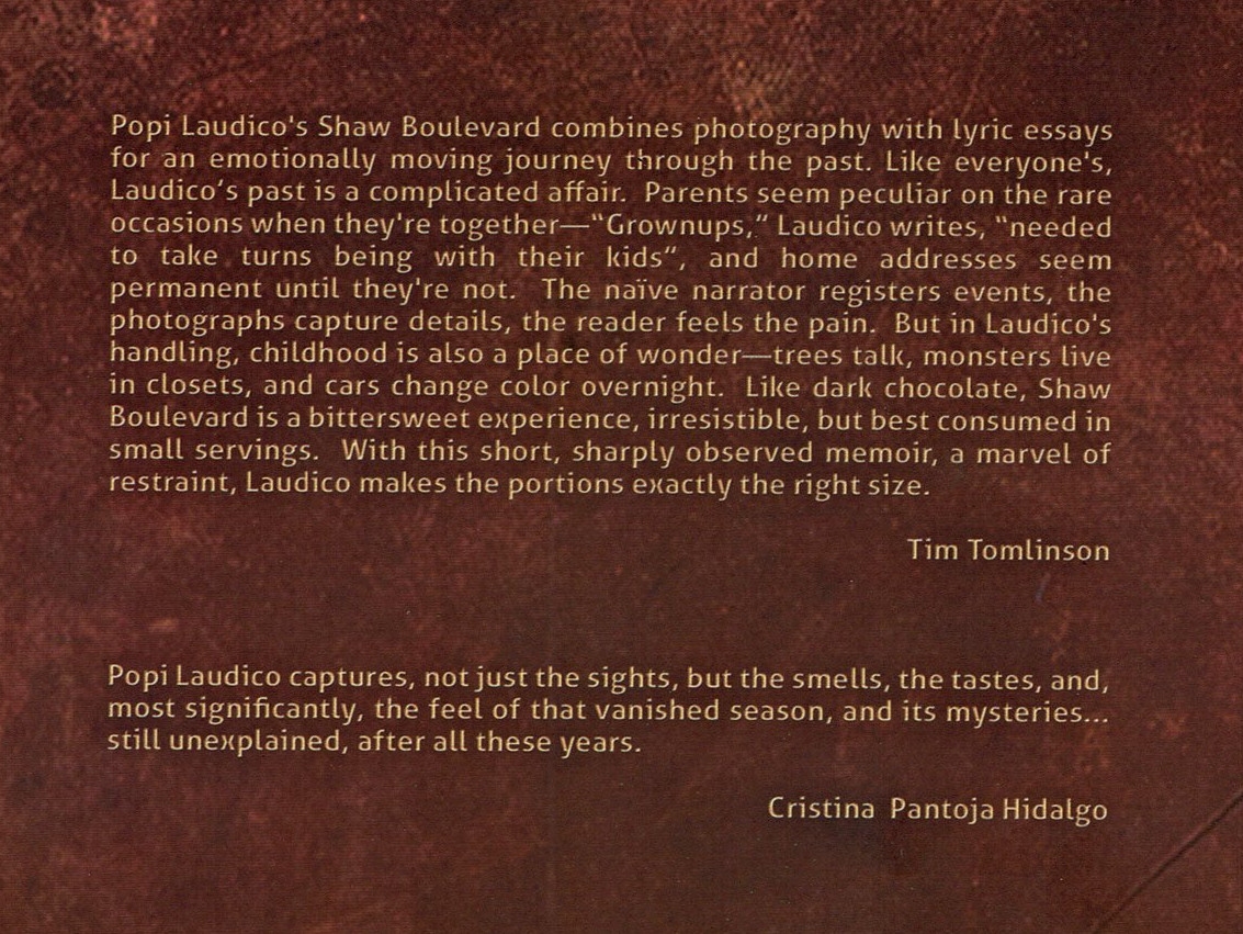 In 2005 Popi Laudico began and still continues to study with Christina Pantoja-Hidalgo (Manila) in on-going year-long creative writing workshops. Through the years these workshops nurtured Laudico’s initial capacity to write into an ability that has seen itself into literary publications.